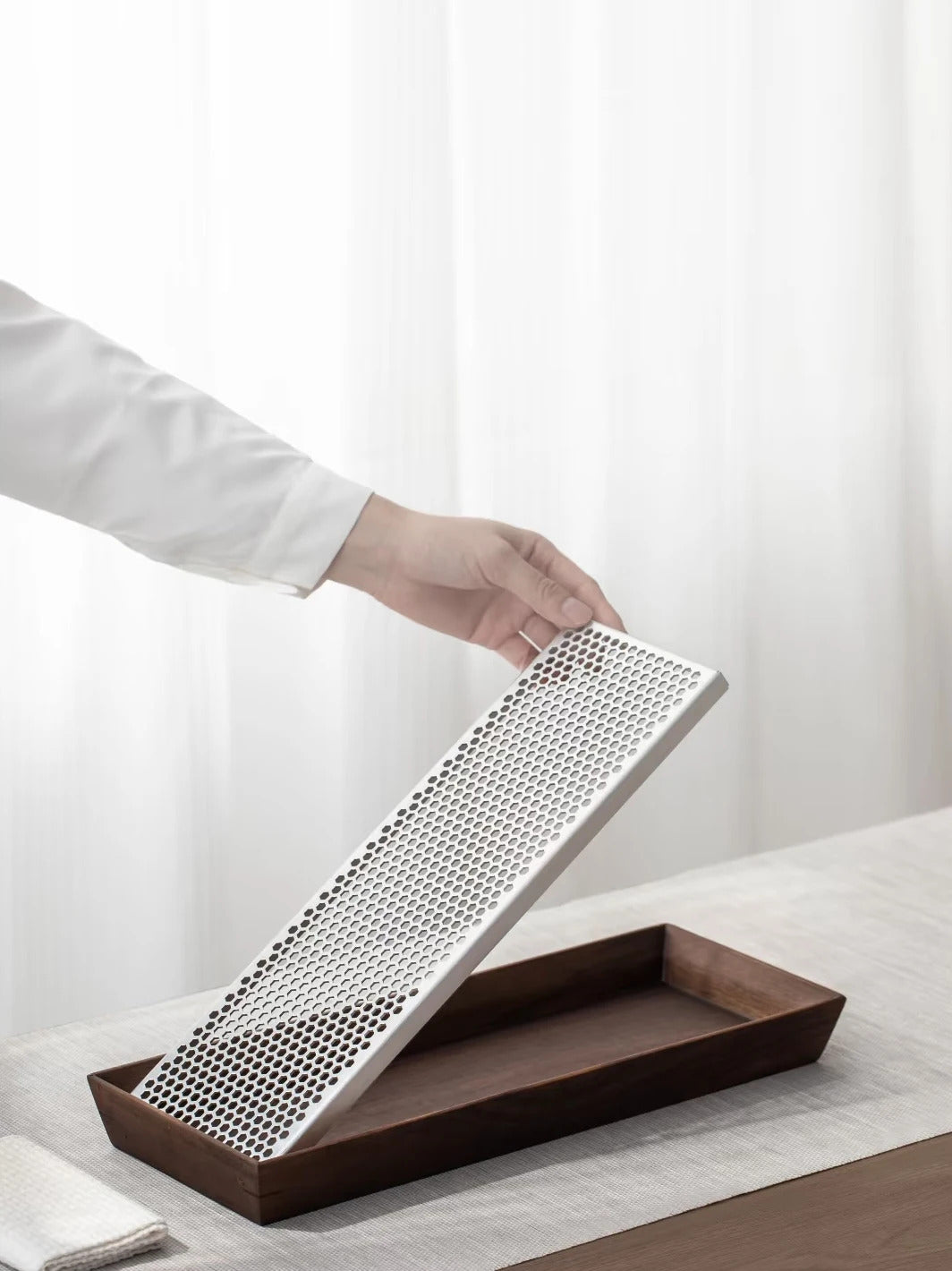 Premium Walnut Water-Catch Tea Tray, Solid Wood + Aluminum Alloy Base, 4 Sizes Available