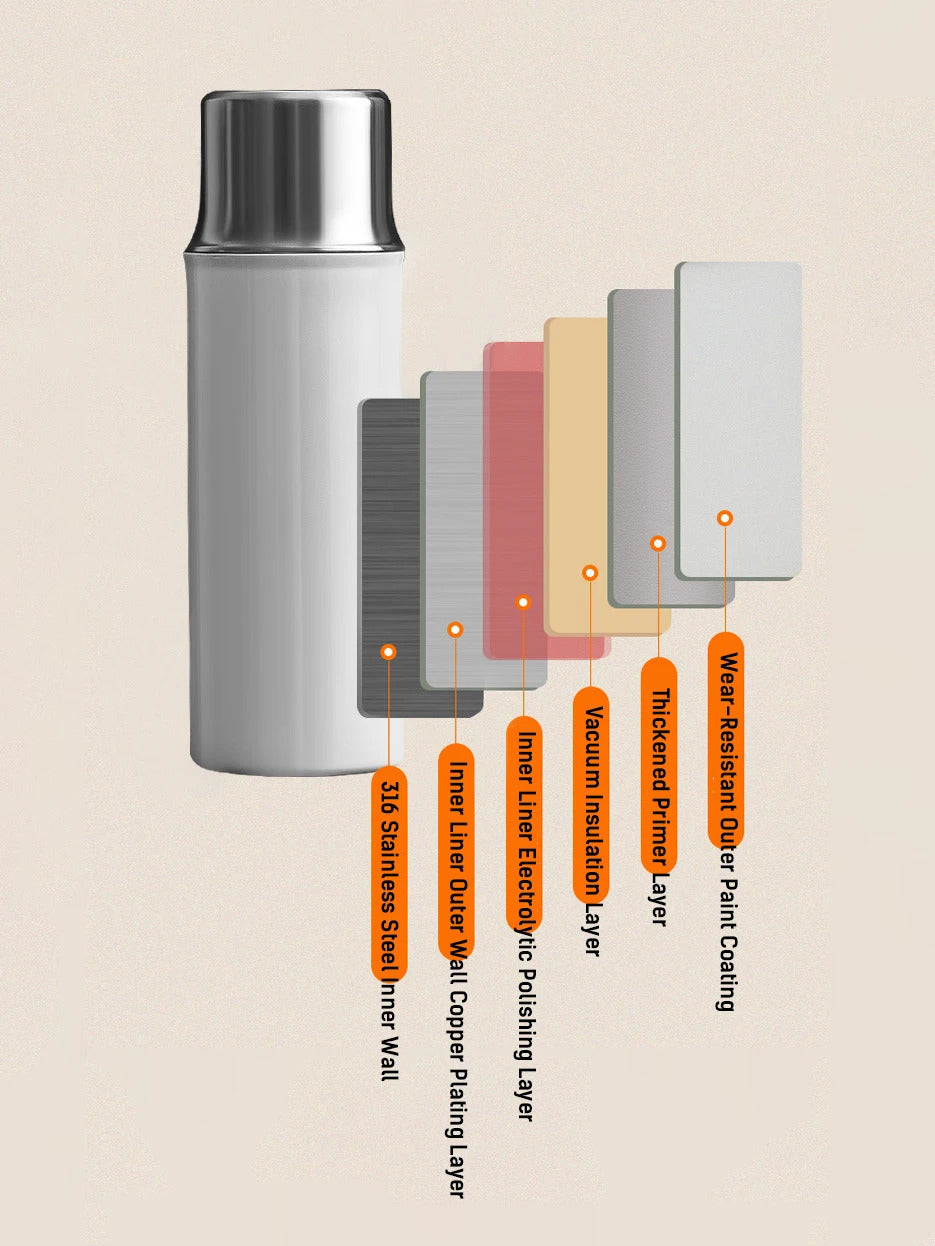 Featuring 6-layer vacuum insulation technology, it maintains temperature effectively—keeping drinks hot or cold for 8–10 hours under normal conditions.
